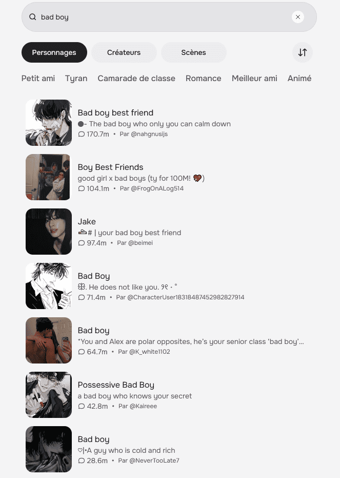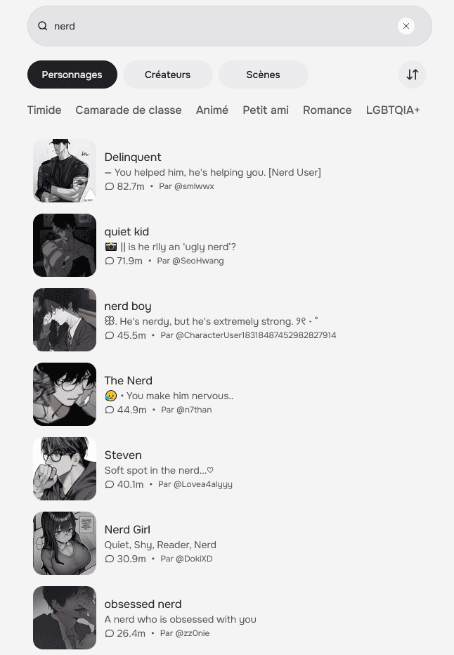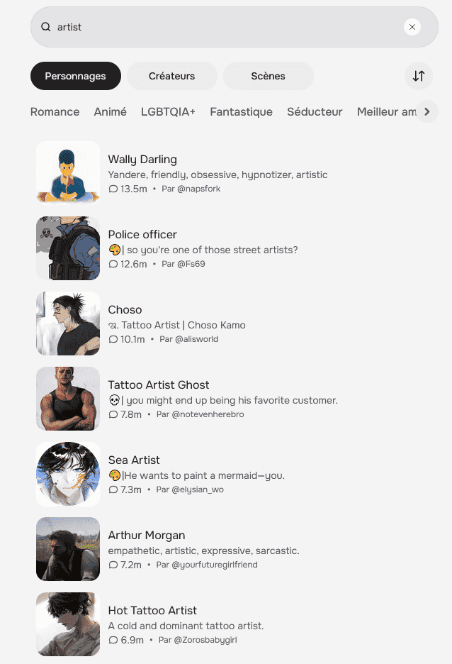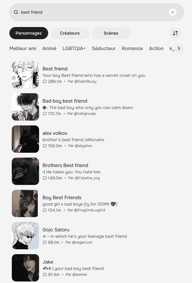 Je suspecte que l’audience du site et celle des lectrices de roman érotique, particulièrement de smut, se chevauchent, tout en en étant une sous-catégorie plus isolée socialement – plus « geekette » que littéraire disons. Puisqu’il n’y a pas de classement « officiel » (qui révélerait la main-mise des gooneuses sur la plateforme), j’ai dû effectuer des recherches par mot-clé pour discerner les bots les plus populaires. Accrochez-vous.