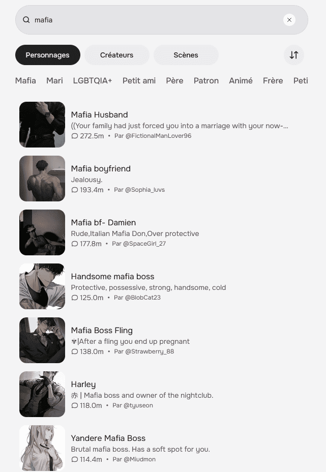 2) le mafieux et toutes ses déclinaisons (plus d’une centaine de bots) : mariage arrangé, boss, homme de main du chef, mari, beau-père, père, etc. – difficile de ne pas tomber sur une version ou une autre du mafieux !