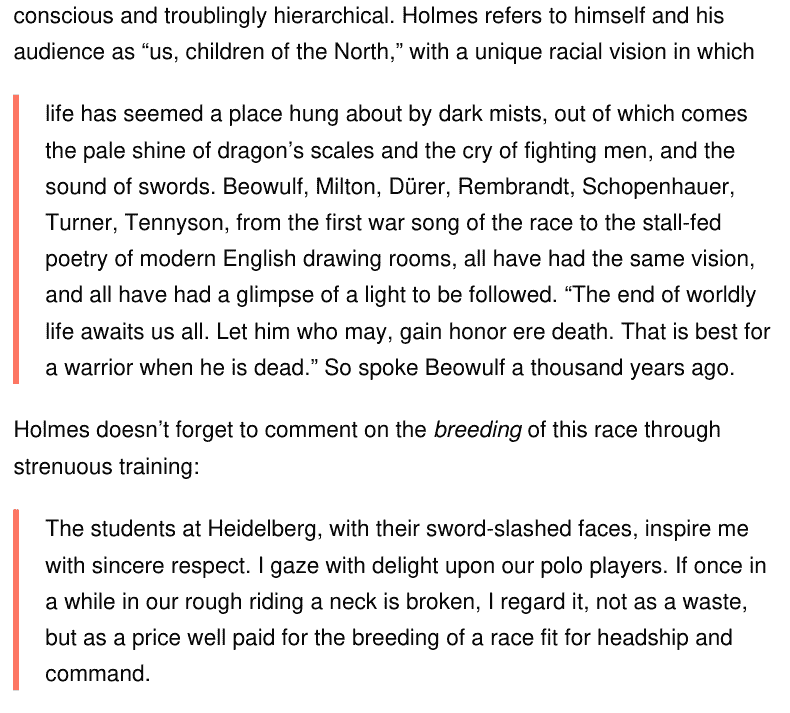 En des termes très explicites, le haut-fonctionnaire Oliver Wendell Holmes s’adressait en 1895 aux étudiants de Harvard pour rendre hommage aux accomplissements des icônes culturelles de l’Occident (de Beowulf à Schopenhauer) et à leur combat, où les étudiants luttent bravement pour la perpétuation “d’une race faite pour commander”. Une vision du monde qui traverse toute l’élite de l’époque, des hommes d’état aux diplomates en passant bien entendu par les militaires.