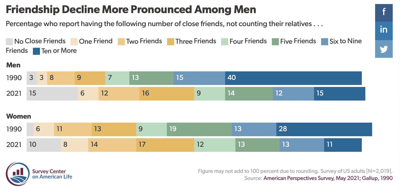 Firstly, friendship is going extinct. The percentage of men who say they have at least 6 close friends has halved since 1990 (itself a late date, when most damage had already been done). Among single men, almost 1 in 5 say they have no close friends whatever. The quality of the surviving relationships is also but a pale shadow of what it used to be before 1950. Besides the ill-effect on one’s personal health, this has had a particularly destructive social effect: men’s complete and utter psychological subjection to women.