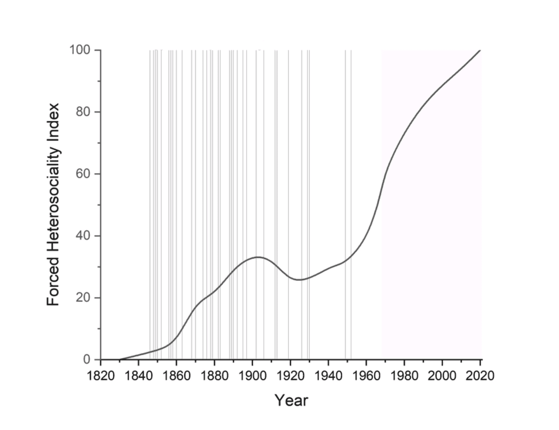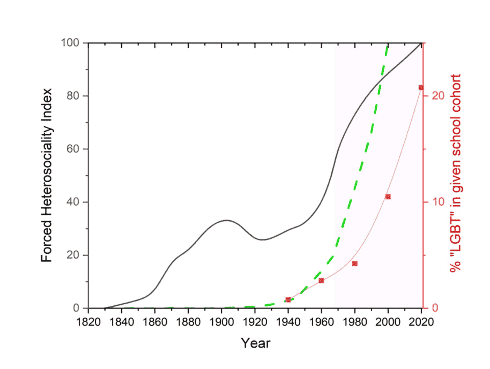 Now, a striking thing happens if you plot the proportion of youth who identify as “LGBT” in a given school year (red curve, right axis) over the FHS graph: the %LGBT curve follows the exact same shape as the FHS curve, but with a lag of approximately one generation. What means? What means is that the effect is likely not direct: in other words, constant steeping in females while growing up does not directly cause boys to become “gay”. No, the effect is mediated by the green dashed line. What is that? That is the normalized Google N-gram of the terms “homosexuals” and “gays” (plural; capturing the semantic shift from thinking of homosexuality as behavior to thinking of it as people). In simple terms, forced heterosociality prevents boys from understanding same-sex attraction. You, dear readers, were deprived of the experiences I recounted at the beginning of this highly personal essay. You are unaware that such things can and do happen to you if you aren’t immersed 24/7 in swarms of females. This made the “gay-straight model” of sexual behavior plausible to you in a way that was not plausible to those that were brought up like me.